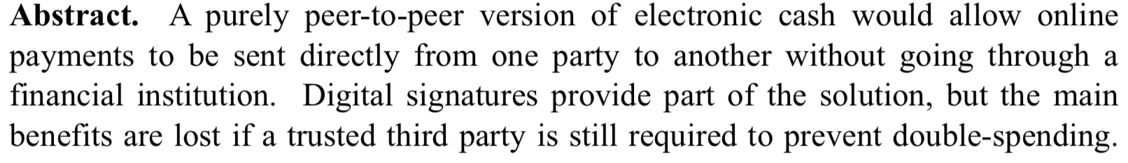 Und zum direkten Vergleich, hier die ersten Worte des Bitcoin Whitepapers: