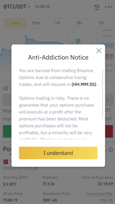 Der Anti-Addiction-Notice genannte Hinweis soll Trader auf das verantwortungsvolle Handeln mit Kryptowährungen aufmerksam machen und Vorfälle wie jene aus den USA verhindern. Trader, die nicht diszipliniert genug sind und nicht wissen, wann man aufhören sollte, erhalten von der Bitcoin-Börse einen Warnhinweis, der auf die Gefahren des Tradings hinweist und User ermutigt, den Handel vorerst zu stoppen: