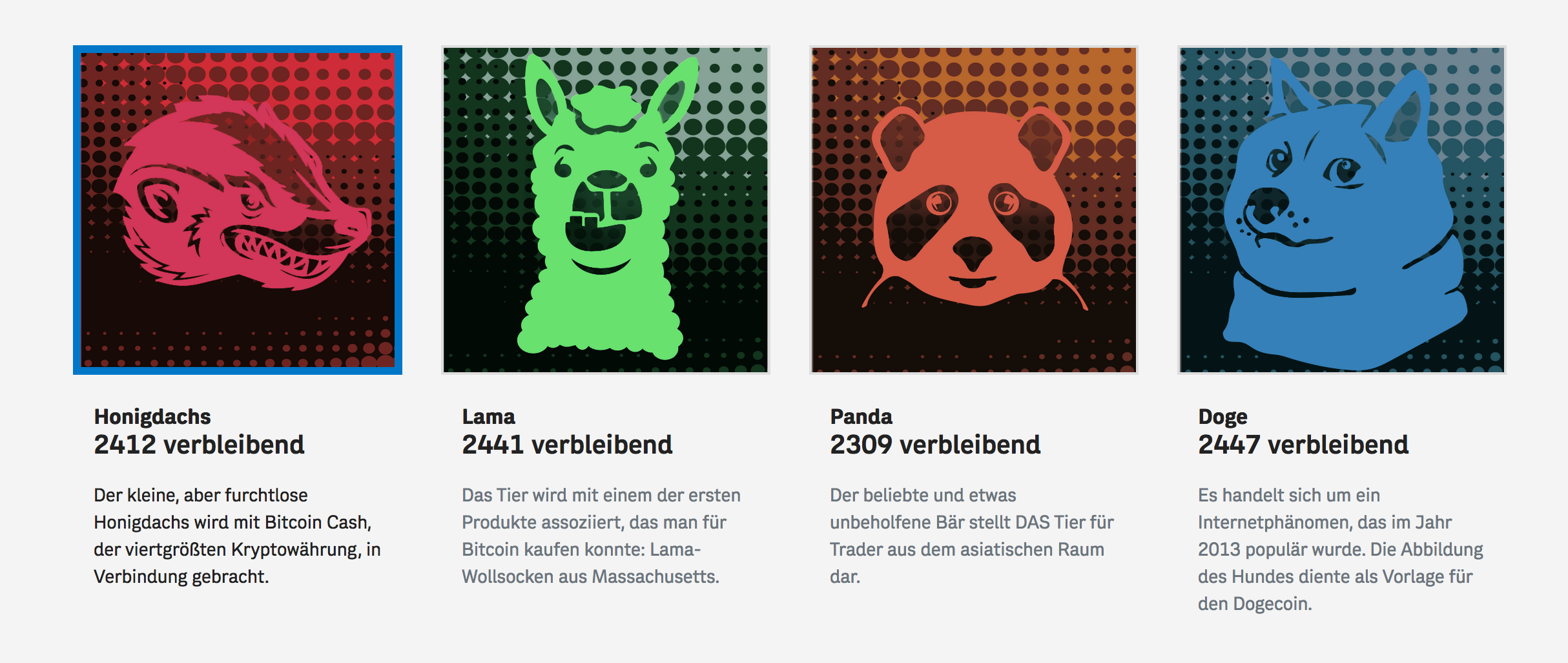 Alle Tiermotive gibt es in einer Auflage von je 60.000 Stück. Im Vorverkauf können pro Tiermotiv insgesamt maximal 2.500 Stück Onchain gekauft werden.