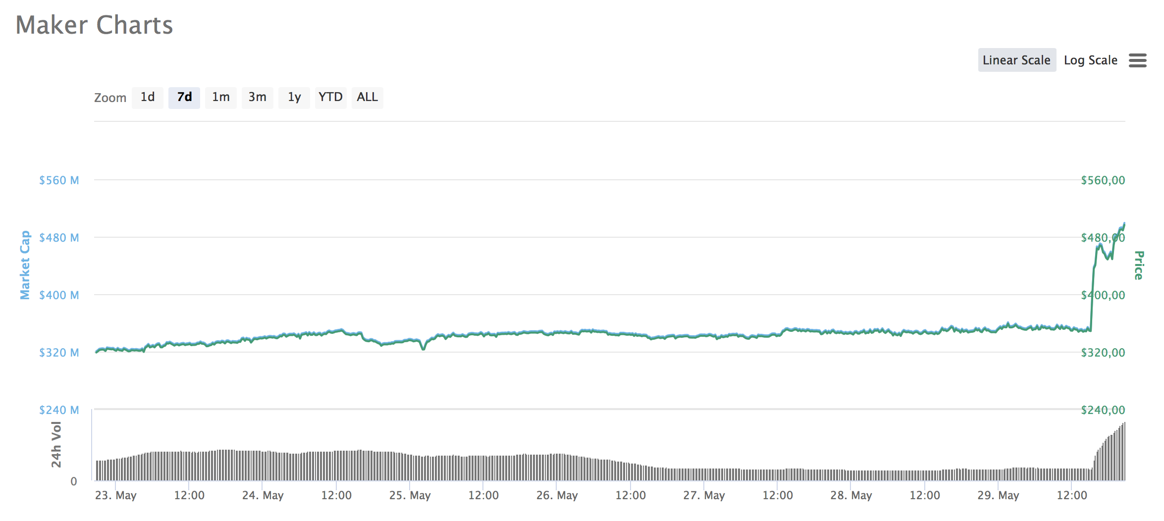 Nachdem Coinbase heute offiziell bekannt gab, Maker (MKR) auf Coinbase Pro zu listen, legte der Kurs um mehr als 30% zu - innerhalb von nur einer Stunde. Doch der Kurs scheint nicht aufzuhalten zu sein. Zum Zeitpunkt des Verfassens dieses Artikels verzeichnete der Kurs einen Zuwachs von 47% und katapultiert die Kryptowährung damit auf den 25. Platz laut Marktktapitalisierung. Der Handelt mit Maker (MKR) ist ab 8. Juni ausschließlich auf der "Pro" Börse von Coinbase möglich.