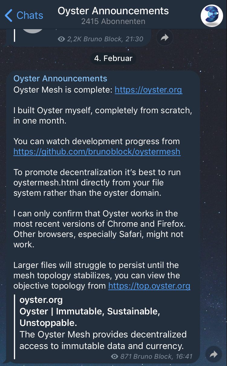 Im offiziellen "Oyster Announcement" Channel bei Telegram veröffentlicht er neue Entwicklungen für sein Projekt. Darin schreibt er: "Oyster Mesh ist fertig. Ich habe es von 0 aufgebaut, innerhalb eines Monats." Das Oyster Mesh Protokoll und dessen Funktionen beschreibt er bei GitHub unter anderem wie folgt: