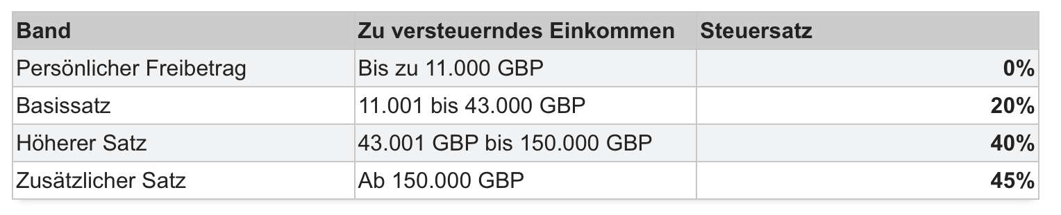Auch die Kapitalertragssteuer ist in Englang abhängig vom Einkommen, wobei ein jährlicher Freibetrag von 11.000 Pfund vorhanden ist. Die Steuerrate liegt bei 18% für Personen der niedrigsten Steuerklasse, der Rest bezahlt 28% Kapitalertragsteuer.