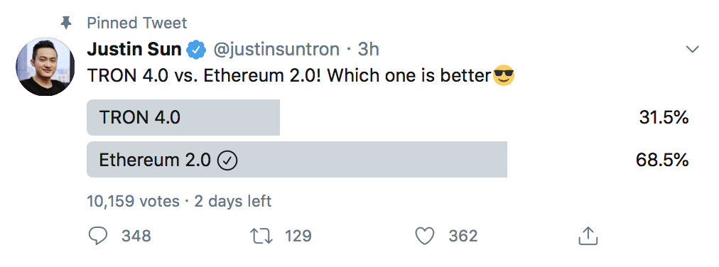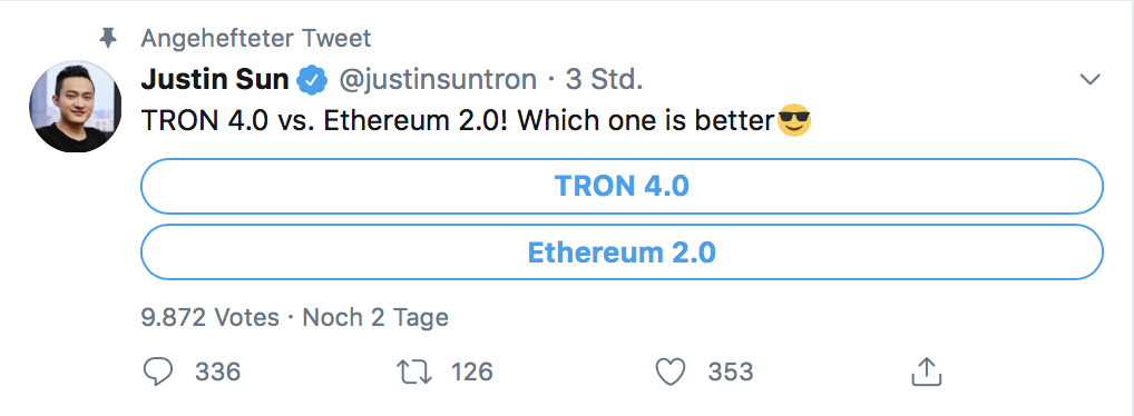 Justin Sun: "Ethereum 2.0 vs. Tron 4.0! Was denkt ihr, ist besser?"
